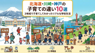 北海道・川崎・神戸の3地域で子育てを経験した筆者が、学校生活や通学、給食、冬の暮らしなど子育ての違いをリアルに紹介。本州との文化や学校ルールの違いに驚いた体験を、ママ目線でわかりやすくまとめました。